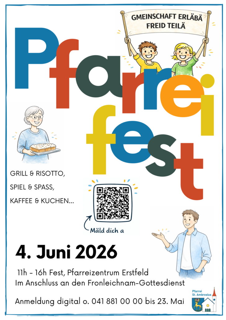 Am 4. Juni findet erstmals unser Pfarreifest unter dem Motto «Gmeinschaft erläbä – Freid teilä» statt. Direkt nach dem Fronleichnamsgottesdienst laden wir herzlich zum gemeinsamen Feiern ein.
